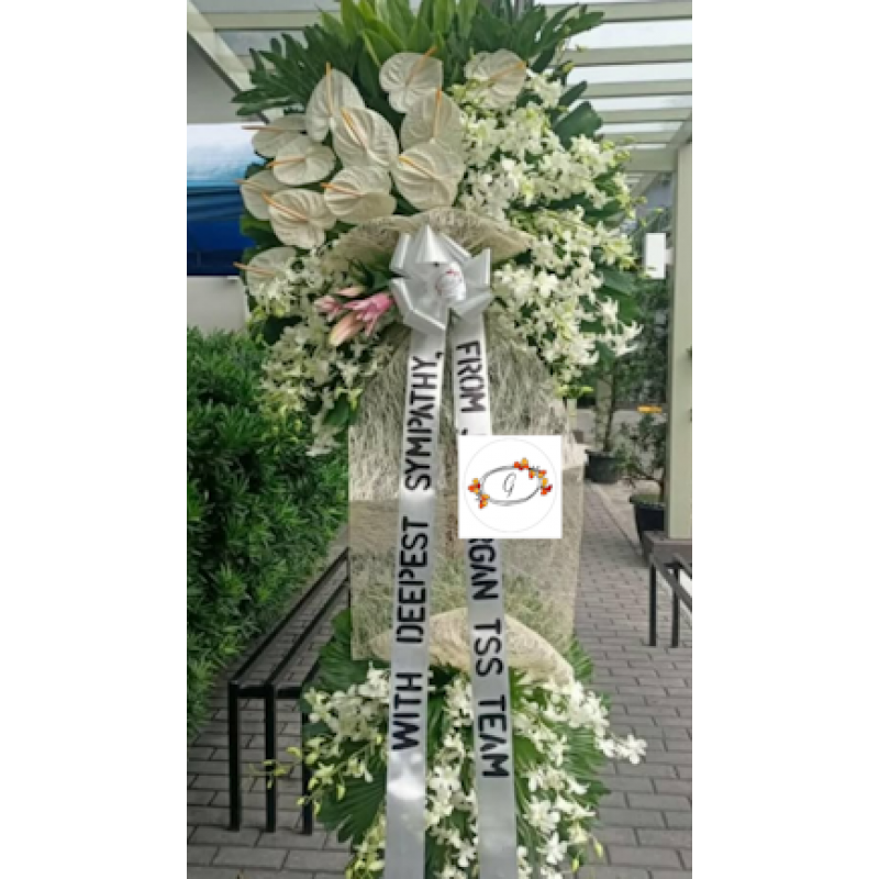 Two-layered funeral flower stand arrangement w/ anthuriums, orchids & stargazer