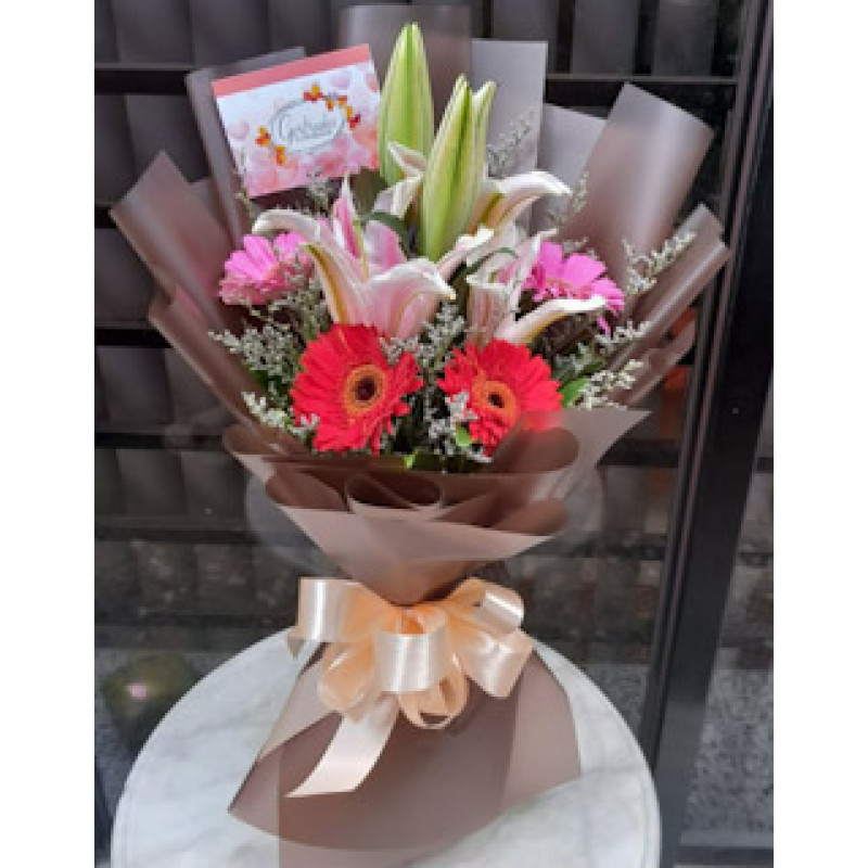 Bouquet arrangement mixed flower gerbera and stargazer.
