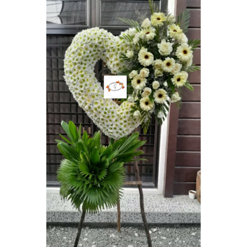 Funeral heart standing arrangemen. All white flowers gerbera,roses and malaysian mums